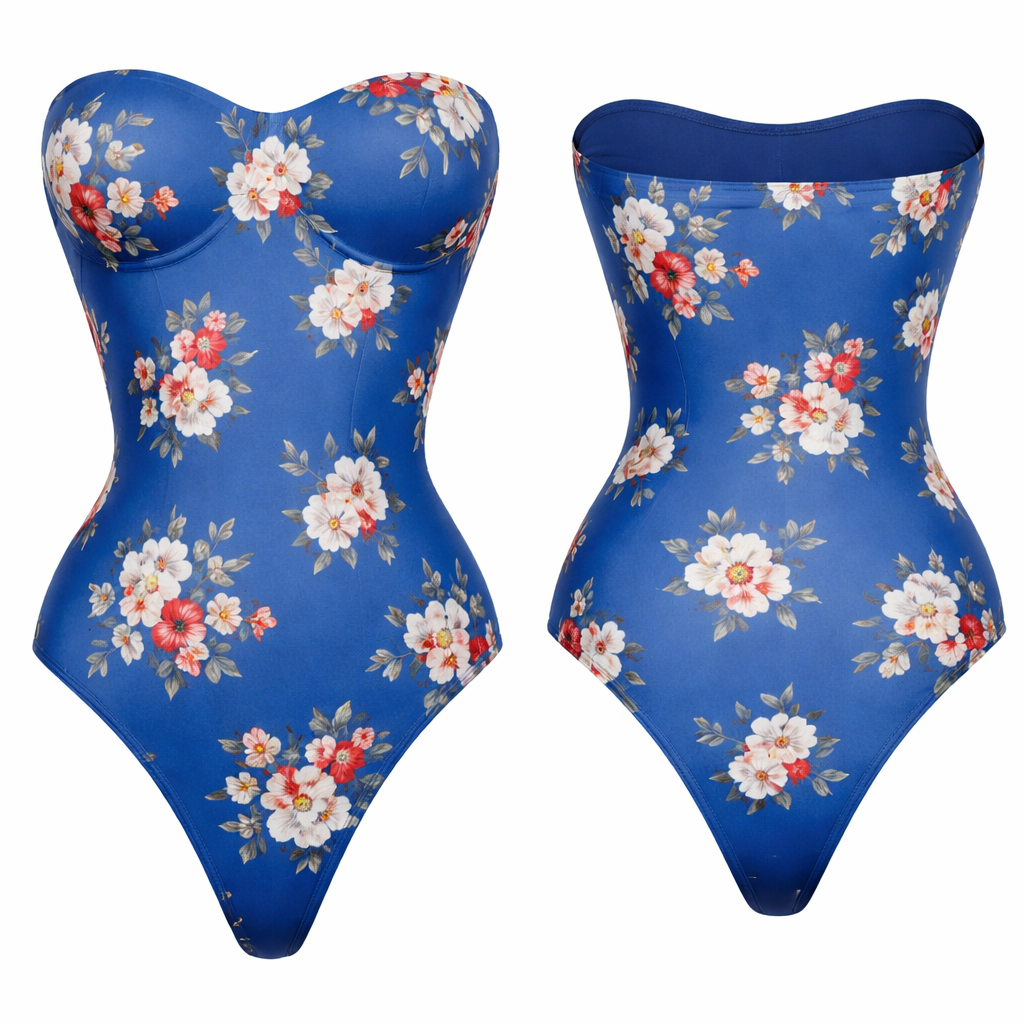Bodysuit shape wear g string no ai model strapless no lines just no bow just string and no back open no ruffles blue with white and red flowers