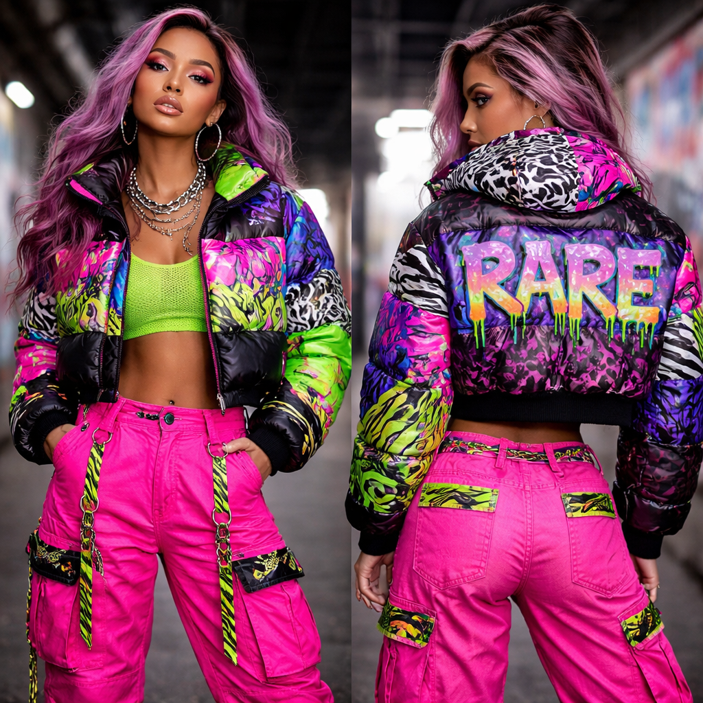 Sick streetwear, new fashion design for stylish women. Bright colors mixed edgy looks And patterns . Add Rare to back panels