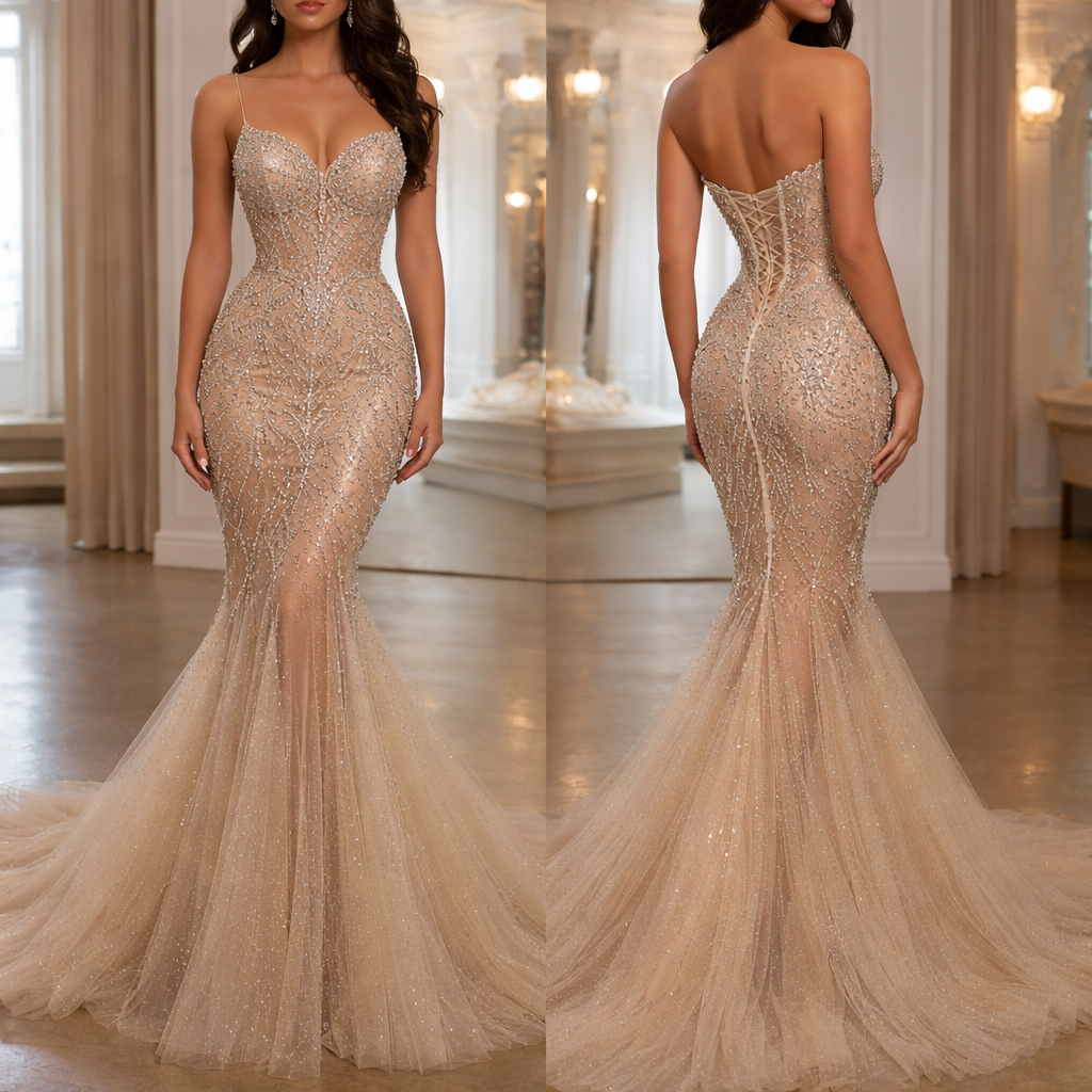 Show an image of a long marmaid dress with corset with bead details