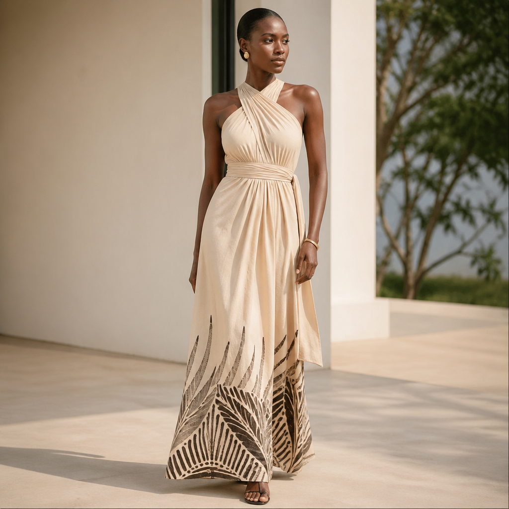 A Female Dress design, suitable for Summer, in Elegant + Quiet Luxury + African style. Kenya fashion aesthetics.