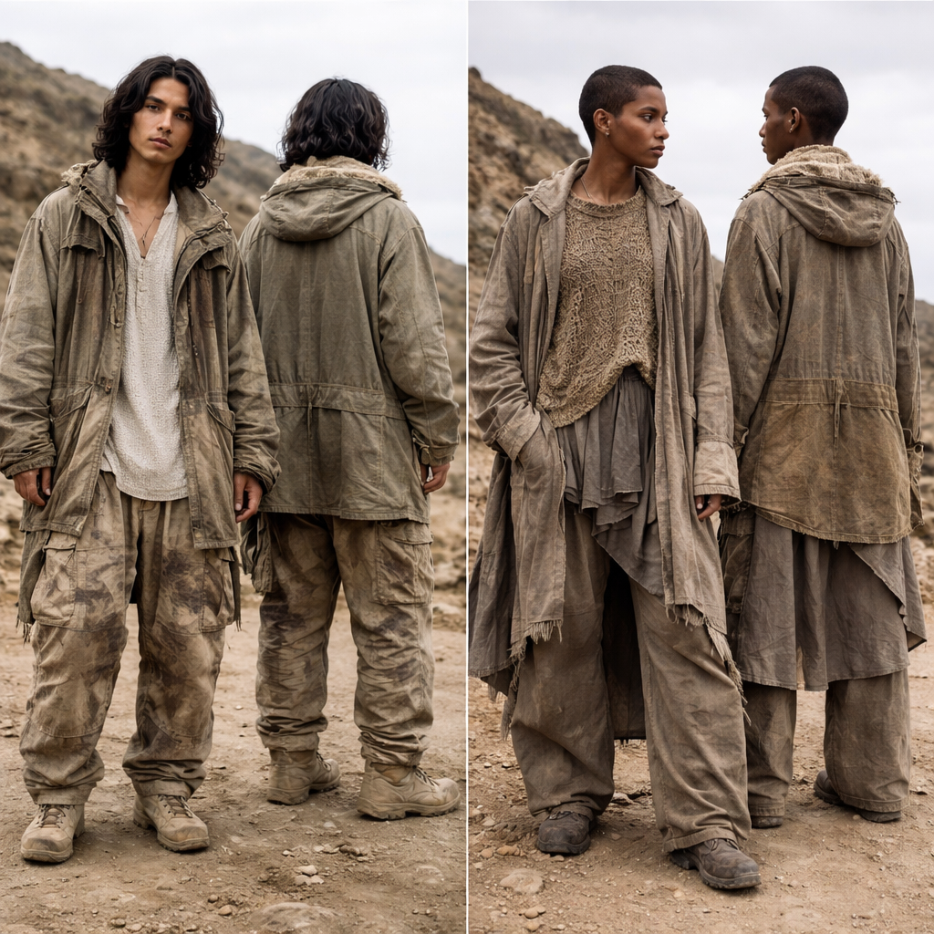 Unearthed Outdoors-driven, earthy looks are recontextualised within a more design-led aesthetic, with a wabi-sabi quality being key. Design strategies Weathered, rustic aesthetics apply a connection with the elements, offering a direction for outdoors and utility themes Uneven layering, irregular textures, proportion play and #RawEdges underpin this story, with non-conforming, size-inclusive silhouettes key for genderless ranges Soil, rocks and minerals influence colour, prints and texture. Extend this Earth-first approach to fabric choices prioritising GOTS-certified and GRS/RCS recycled cotton, natural fibre blends and FSC-certified Tencel lyocell This story is also very much about resilience and resourcefulness, so experiment with #DeadstockDesign, creative mending and repairing Ones to watch: Song for the Mute’s (Australia) The Desert Rose collection evokes the beauty and resilience found in harsh environments, embodying perseverance and growth. Pearled Ivory’s (US) deadstock leather jackets evoke natural landscapes. Kartik Research (India) uses Kantha stitch, hand block-printing, natural dyes and weaving in contemporary cuts for its ‘Indian Future Vintage’ styles Relevant for: utility, outdoorwear, denim, outerwear, knitwear, earthy style, show front and back