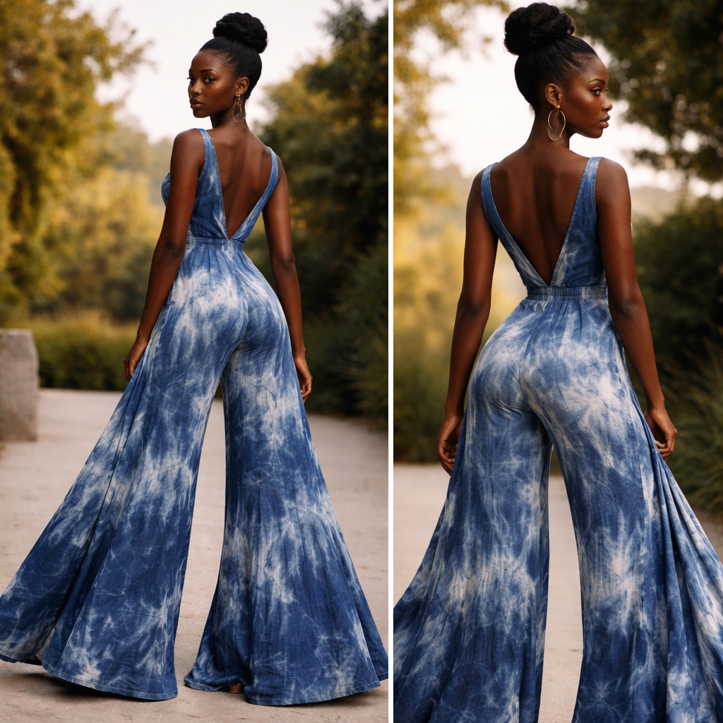 make the model brown skinned and more african looking create a bodysuit jumpsuit in tye died indigo natural looking in cotton or linen with wide flares on the bottom v shaped back a elegant and effortlessly graceful look