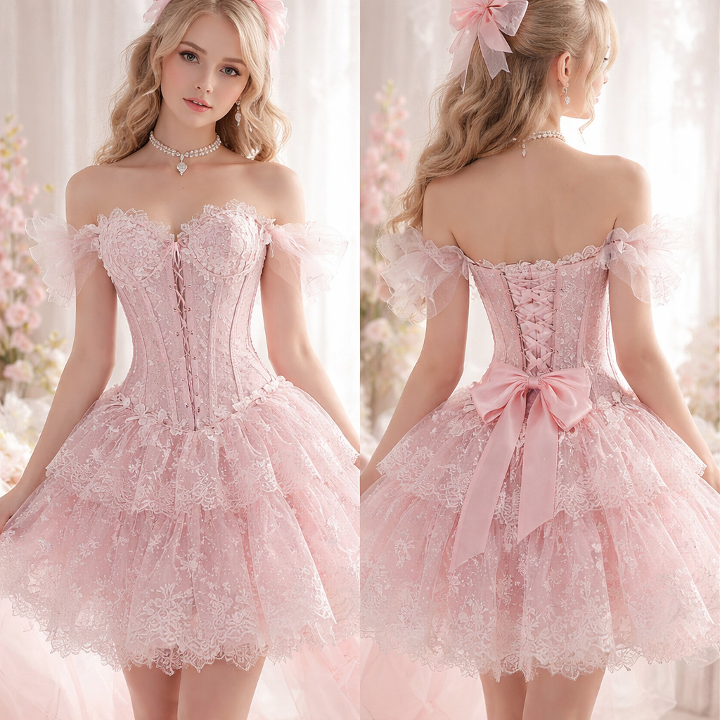 Baby pink corset dress, laces skirt, princesscore style, show front and back