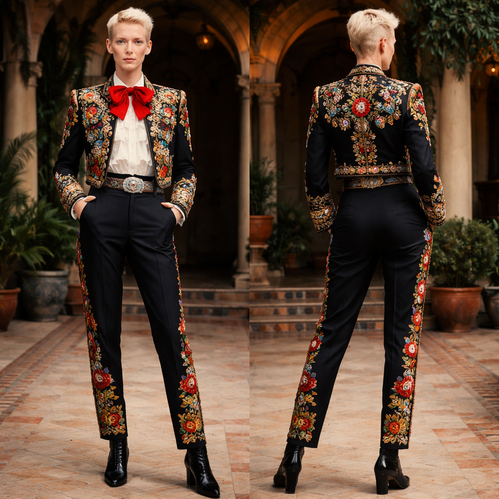 Cigarette pants Androgynous Tilda Swinton , mexican style, show front and back