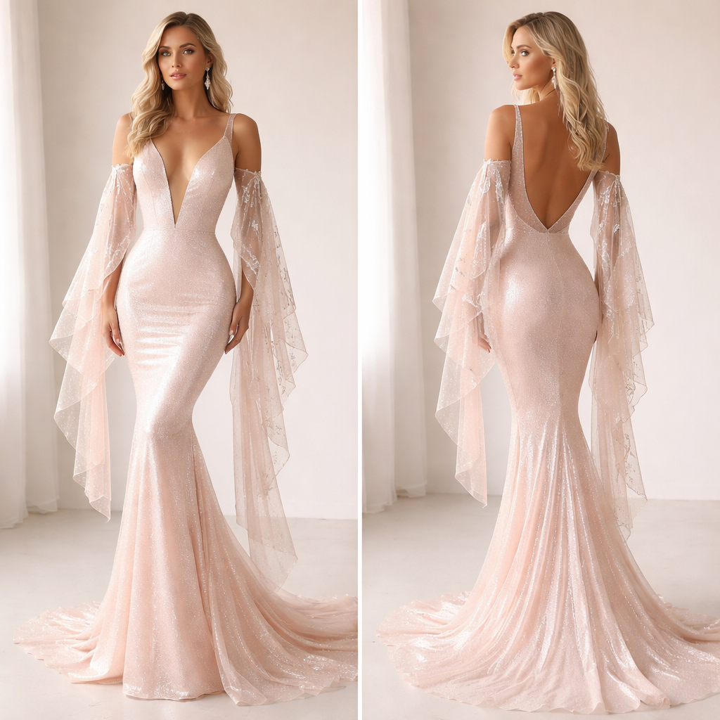 Tight dress especially around the waist, light pink and shell like colour's with lace sleeves which hang and a tail by the feet, a deep v neck down to the stomach but not below the belly button. Must have themed be shimmering , minimalist style, show front and back