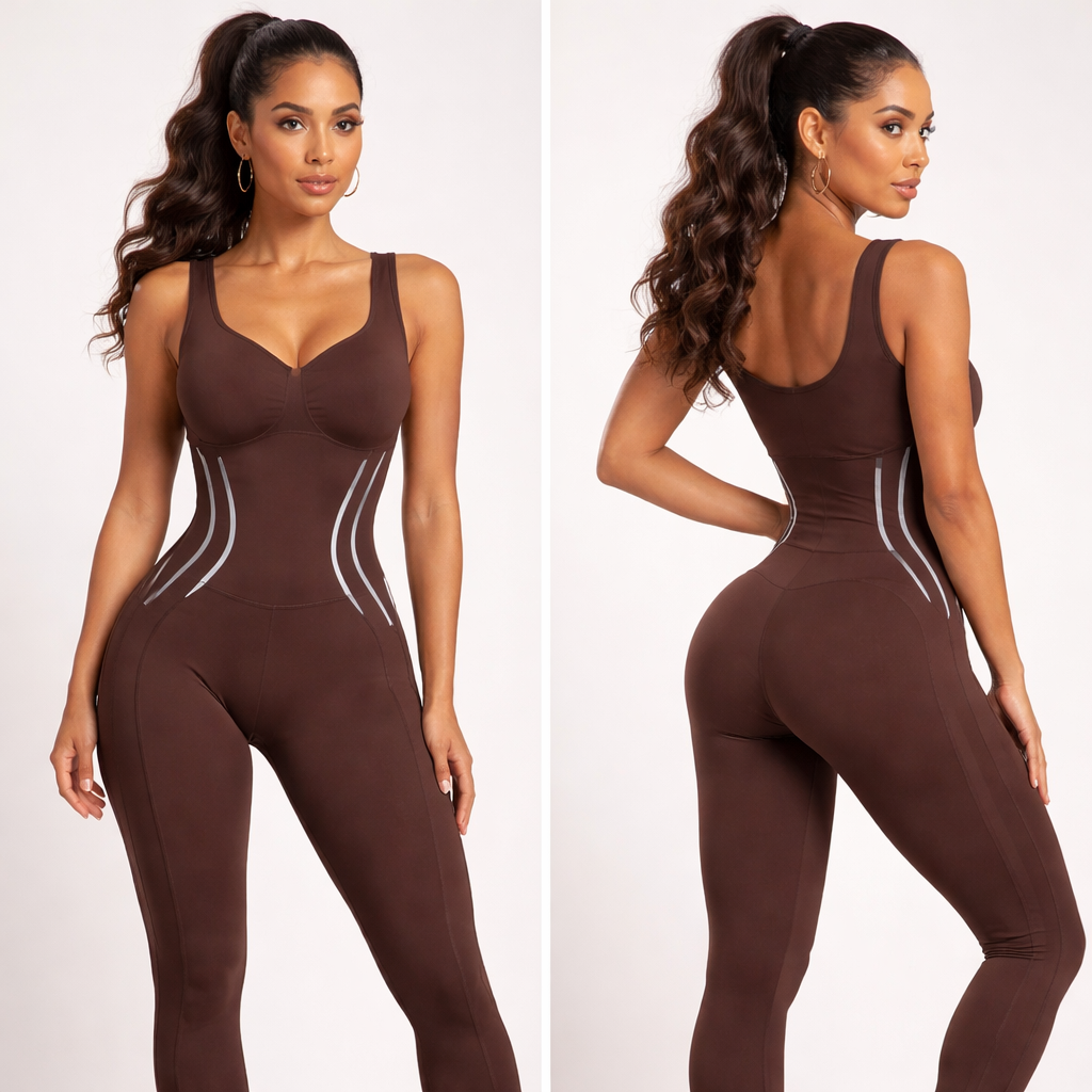 Brown Active wear jumsuit with built in shapewear that snatches the waist and lifts the butt with a built in bra with wide straps 2 Vertical white lines on the waist that emphasize the snatching of the waistline