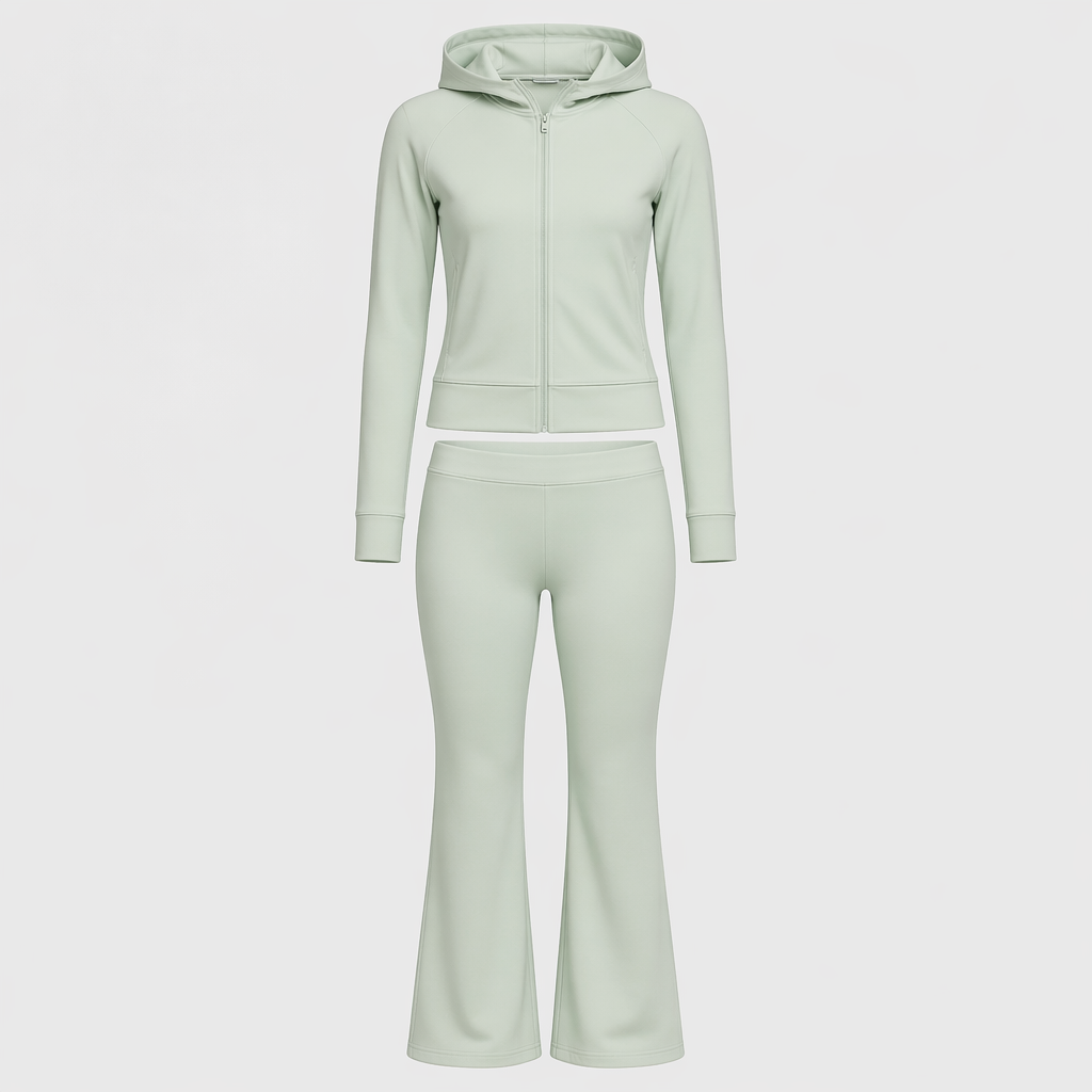 photorealistic fashion design, photorealistic fashion design, photorealistic fashion design, A Unisex Top design, in Casual style. Zip-up hoodie. Seamless, soft fabric, navy, everyday use, no tags.. Sweden fashion aesthetics., casual style, just the design no text. Refinement: Make it pastell green instead. , just the design no text. Refinement: Make pastell green boot cut sweatpants instead. , just the design no text. Refinement: Make them seamless
