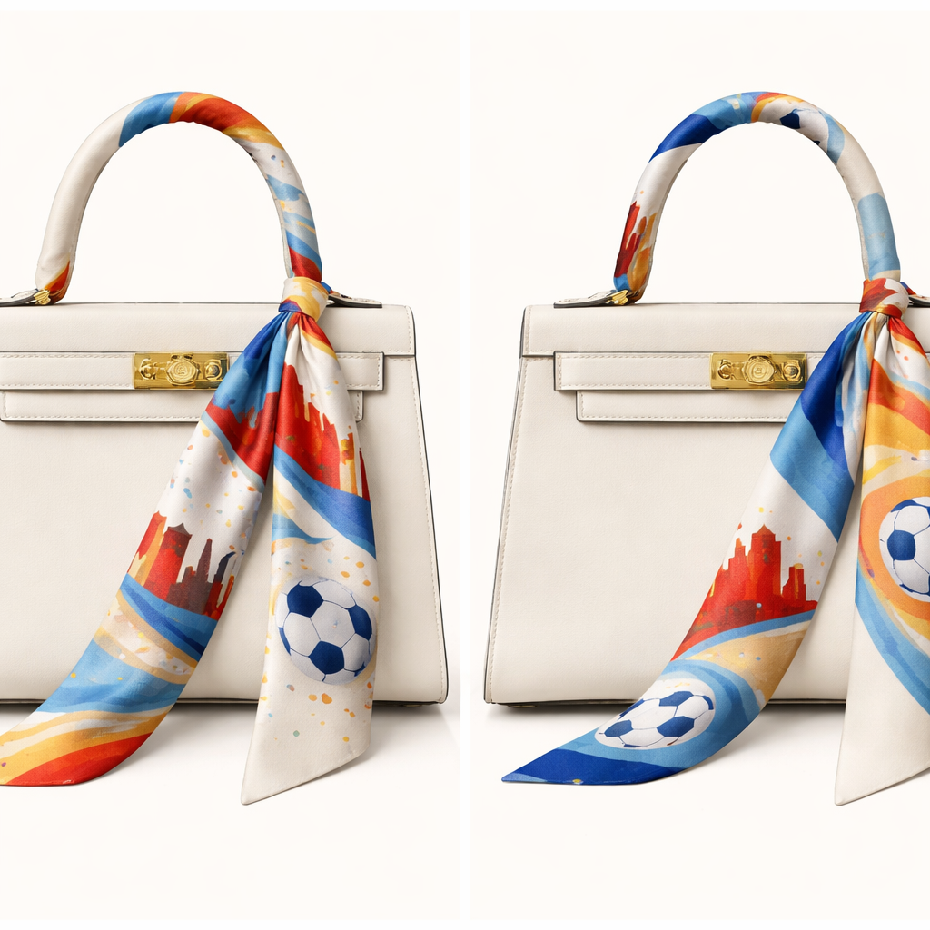 Design a silk scarf that is 5x 86cm to be a host city scarf for the World Cup 2026 for Kansas City MO. No words or logos but simple but abstract and tailored . Now element of celebration of being on the world stage. A lot more simple. Keep the colors scheme but make sure it looks good when it’s wrapped around the top handle of an Hermes style Kelly bag, classic style, show front and back