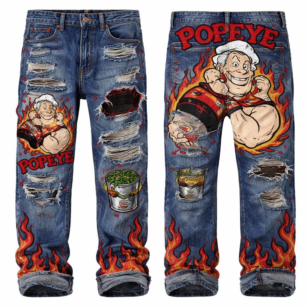 Custom red stitched tore prints rocker blue jeans Popeyes theme