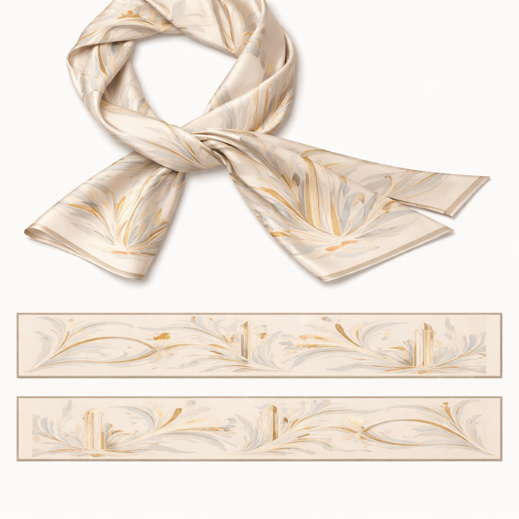 design a silk scarf that is 5x 86 cm Luxury silk scarf design inspired by Kansas City as a host city, refined and timeless, abstract flowing fountain motifs, subtle sense of movement and celebration, soft architectural lines inspired by Art Deco buildings, neutral base with warm accents, sophisticated color palette, minimal and modern, no text, no logos, fashion editorial style, high-end silk scarf flat lay, seamless pattern, elegant and understated, classic style, show front and back