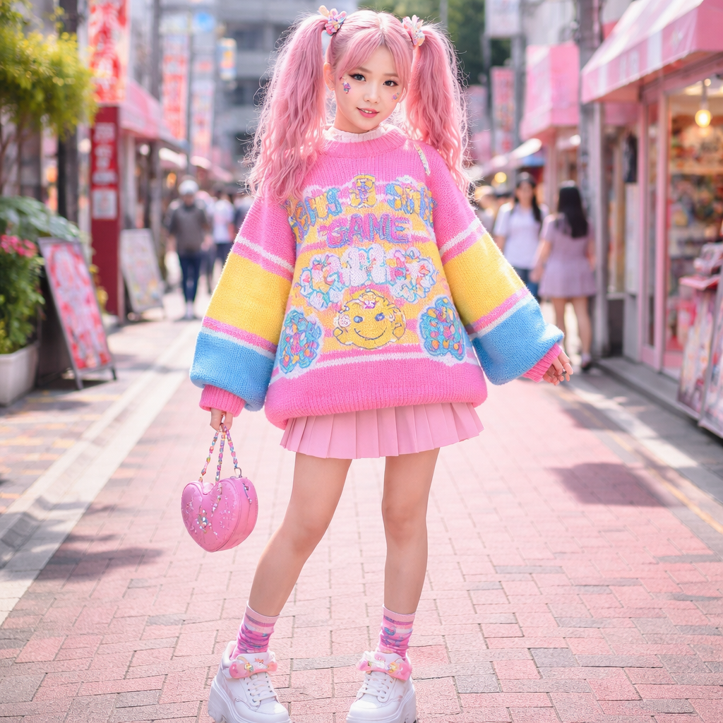 Japanese Street fashion design: **Enhanced Prompt:** A chunky cotton sweater in neon pink, yellow, and blue, featuring a playful board game graphic. Oversized fit with wide sleeves, paired with a pleated mini skirt and platform sneakers, embodying a Harajuku cute aesthetic.