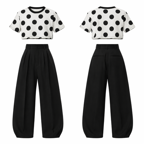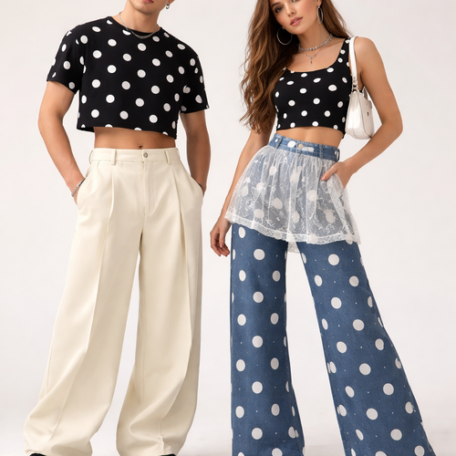 I want to design sets of men's tops and bottoms that closely follow current trends. For the men's wear, the top should b...