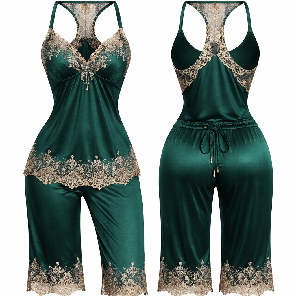 Create a luxury sleep set with three quarter pants and a sexy racer back top. The design should include lace and eye catching vintage inspired details in a deep jewel colour , sleepwear style, show front and back