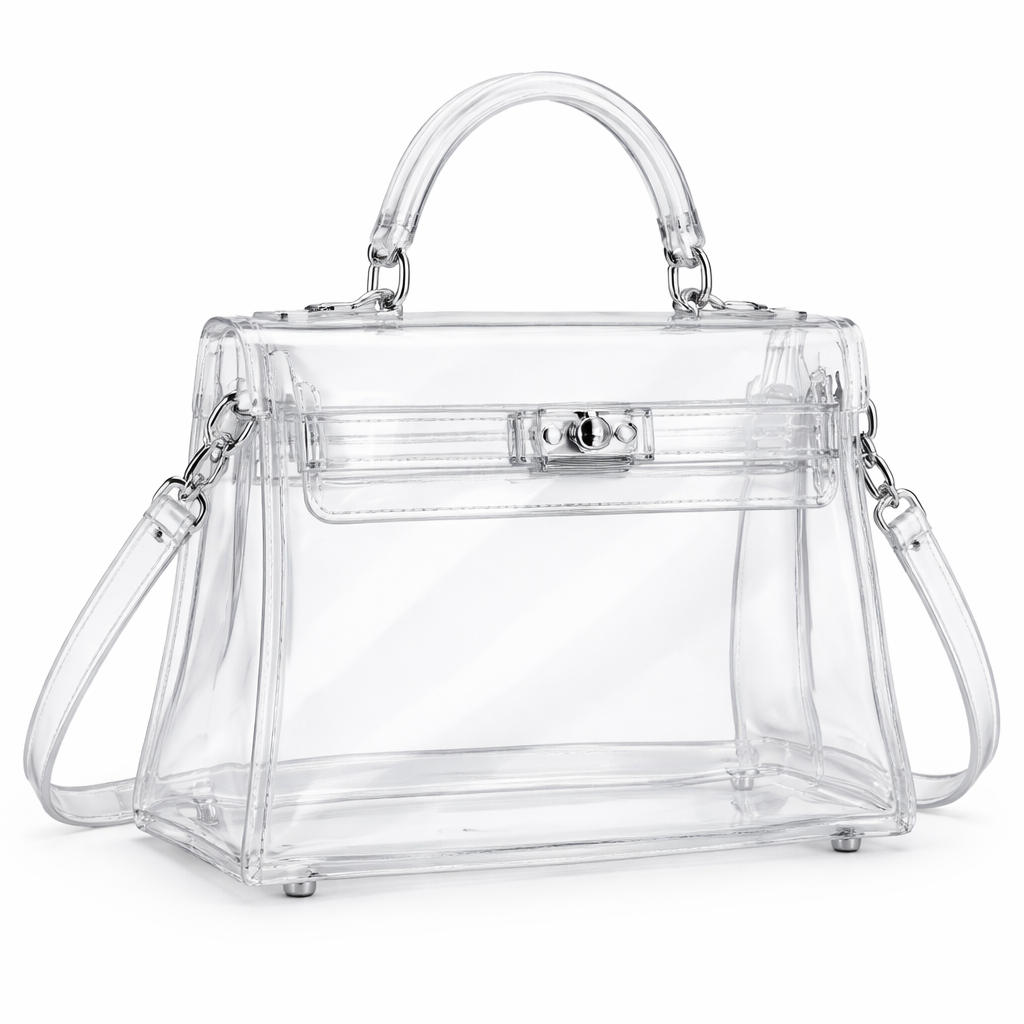 Design a clear handbag that is stadium approved. Dimension cannot exceed 12 inches by 6 inches by 12 inches. It needs to look like a Kelly style bag. Make it all clear. Also make it not so smiles to the actual Kelly bag, classic style