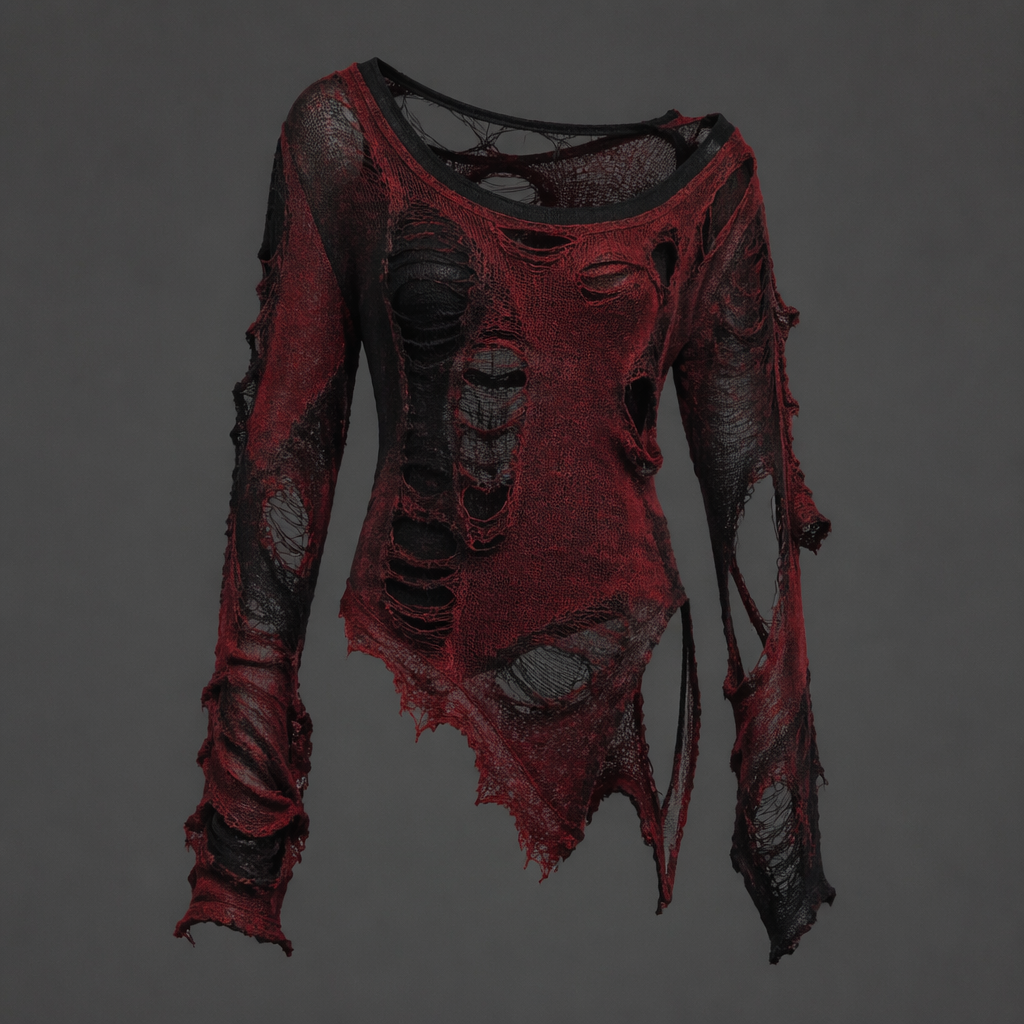 photorealistic fashion design, in Gothic style. Кофта порваная к красным отенком. Poland fashion aesthetics., gothic style, just the design no text