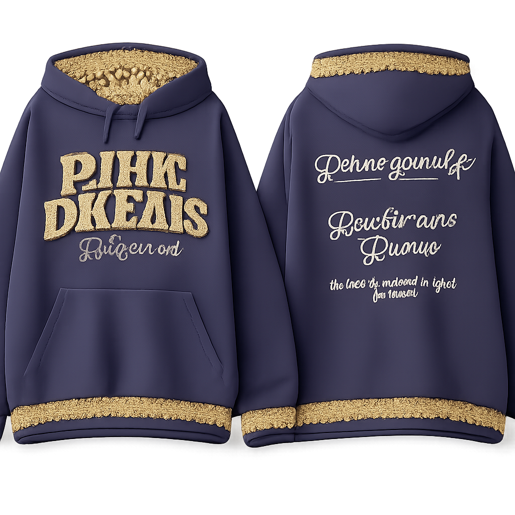 Coton ouater mid size de couleur bleu marin.Logo écrit avec des lettres majuscules et épaisse en relief 3D de couleur jaune pale avec motif de leopard(taches dorées).Le logo c’est « PINK DREAM ».En dessous en écriture fines et attaché en jaune/ doré ce sera écrit « by Girly Memory »Dans le dos du coton ouater dans la même écriture attaché et fines, ce sera écrit « Dream your life » et en dessous bien aligné ce sera écrit « Then live your Dream »,c’est 2 phrase de la même couleur que le texte a l’avant du coton.Plus bas dans la même écriture cette fois ci en blanc ce sera écrit « Just live your teenage Dream ».Sur les extrémités des manches donc la partie qui entoure le poignet ce sera la même couleur et le même motif que le logo c’est à dire un motif léopard avec fond jaune et taches doré.Ce même motif ce trouvera aussi sur l’élastique qui est placé autour des hanches du coton ouater et dans l’intérieur de la capuche du sweater et l’intérieur de la poche ouverte des deux côté à l’avant du coton.puis pour finir juste au haut de l’élastique qui fait le tour des poignet donc les extrémités de mes manches et l’élastique autour de mes hanches,il y aura un motif de vagues qui se suivent partout autour donc 2 ligne de « vagues » la 1er jaune comme le fond du motif léopard et la 2e doré comme les taches du motif léopard.Desole de la longue commande merci beaucoup et stp!les phrases ( logo) pourrait il être en anglais stp?, show front and back