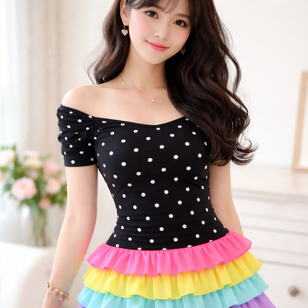 Korean Fashion fashion design: **Korean Fashion Inspired:** Pretty black form-fitting cotton shirt. White polka dots. Layered bottom with hot pink, yellow, aqua, orange, and lavender ruffles for a playful, sweet aesthetic.
