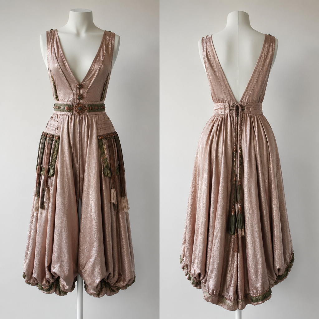photorealistic fashion design, Rose gold jumper dress with brown and green highlights in hair with baby blue eyes , boho_chic style, just the design no text, show front and back