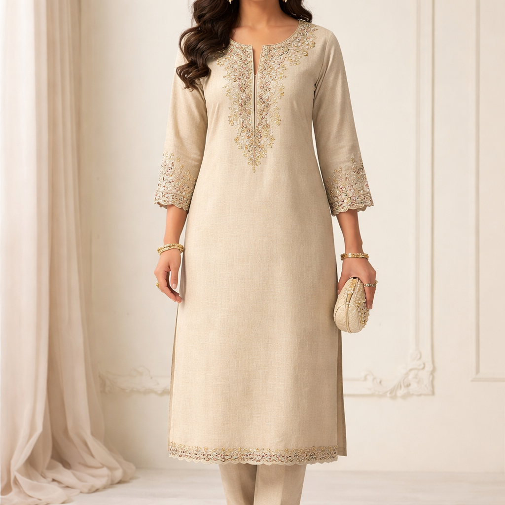 Pakistani straight kurti with pant with aari tari work in neck front or sleeves
