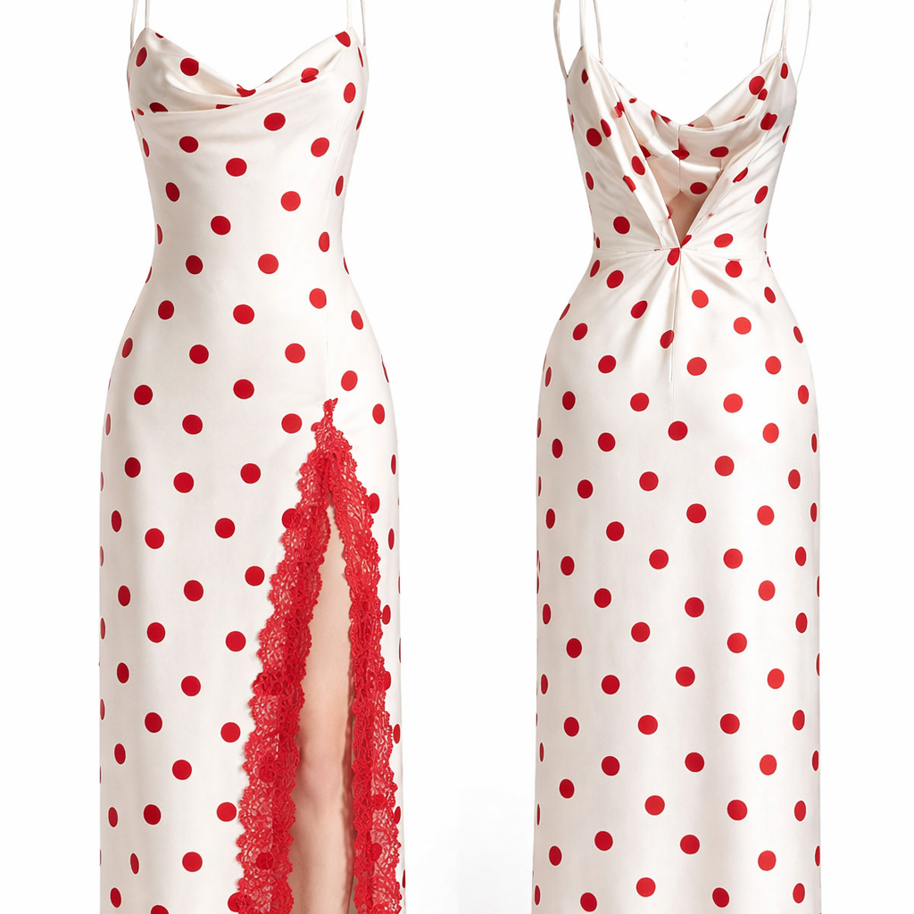 Vestito lungo satinato stampa pois con pizzo su spacco.Lunghezza 120 cm.pois rossi su fondo bianco.pizzo rosso, minimalist style, show front and back