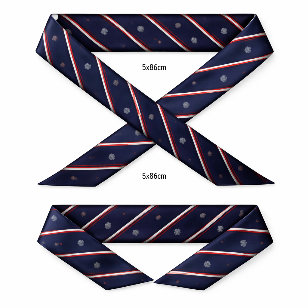 Silk twilly scarf 5x86cm, Kelly bag wrap style, J. Press preppy, deep navy base, thin diagonal white stripes with thinner red stripes, subtle tiny gray abstract soccer balls, minimalist, symmetrical, elegant, clean, no logos or text., show front and back