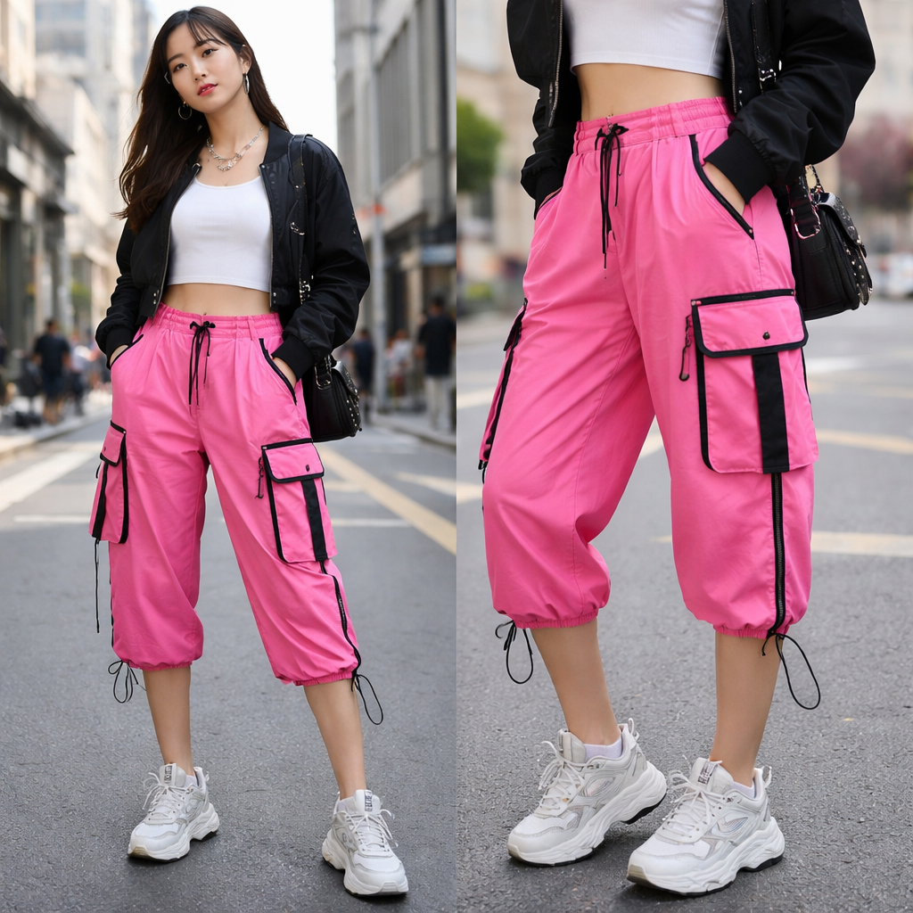 Korean Fashion fashion design: Hot pink lightweight cotton capri cargo pants, relaxed fit, with black trim and subtle utility pockets, Korean street style.