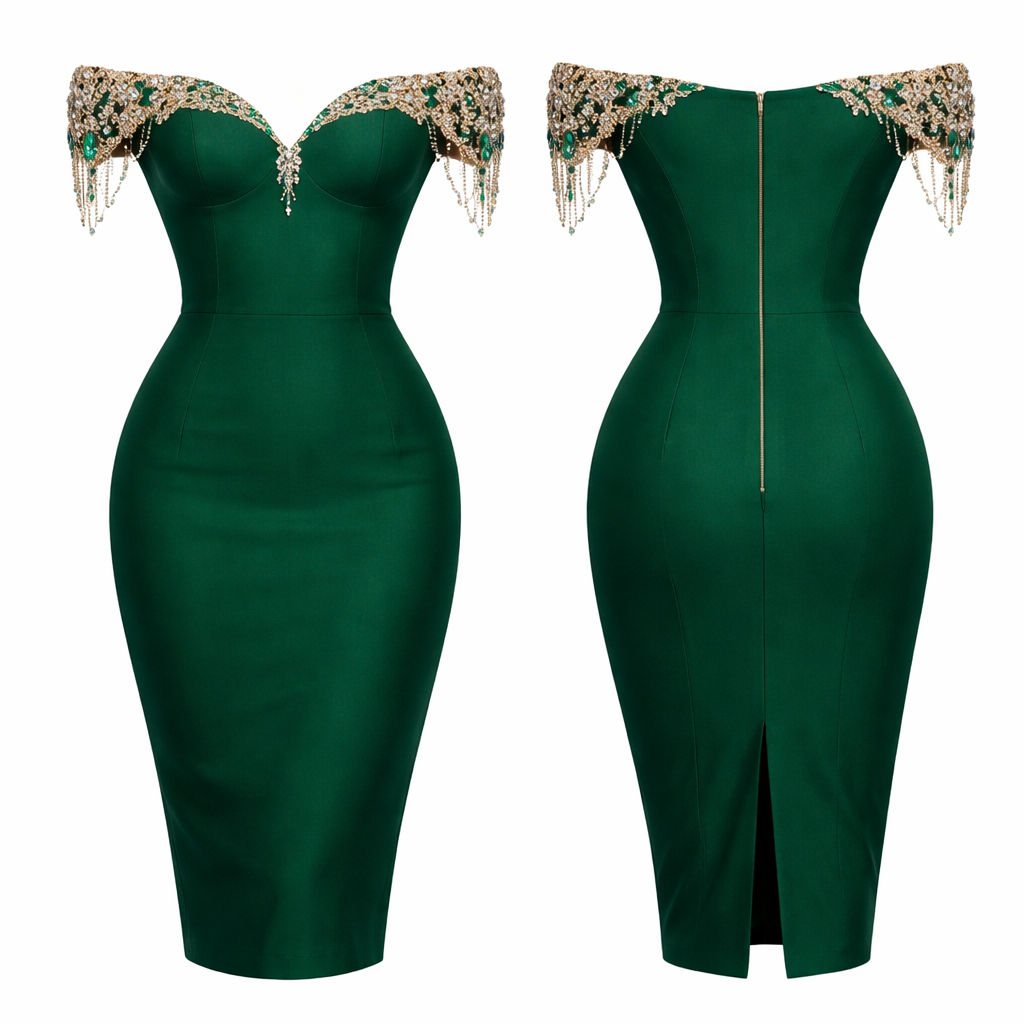 Create me a pencil dress plain bold color with embellishment , show front and back