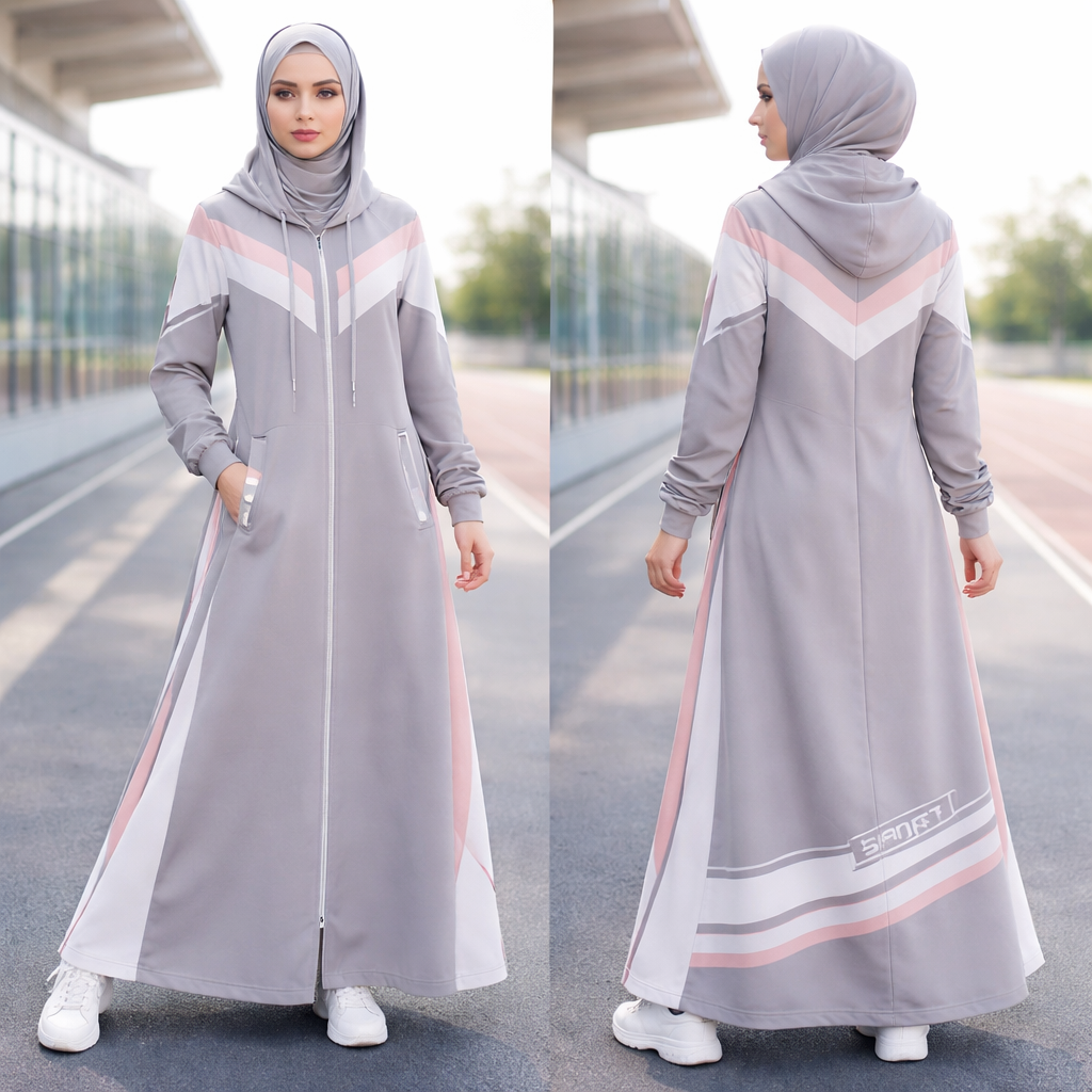 A sport friendly women’s aesthetic and pretty abaya with hijab , sporty style, show front and back