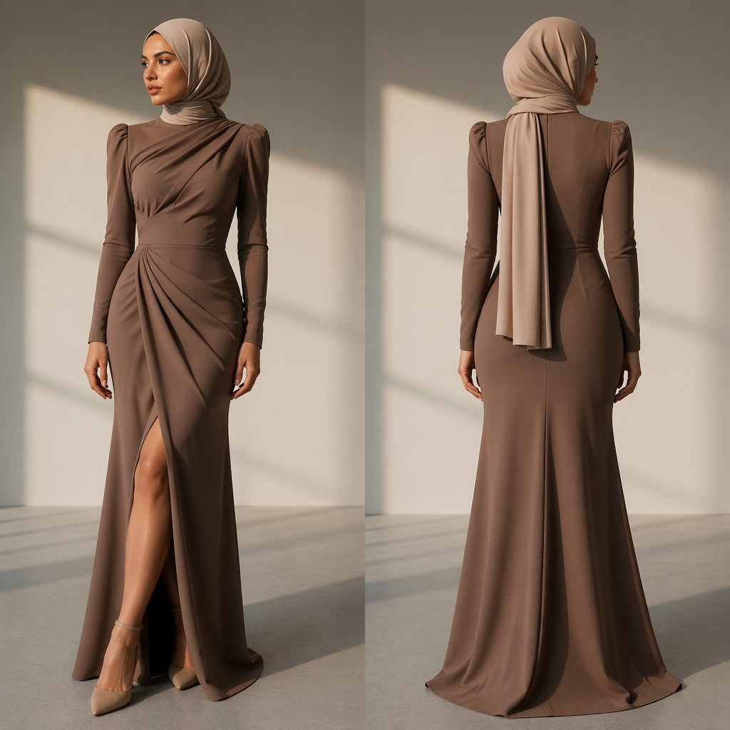 photorealistic fashion design, Hi i need to make a western clothing that is hot classy smart .preferably it can be a dress.It has to be some thy ing muslim women can wear but still look sexy, classic style, just the design no text, show front and back