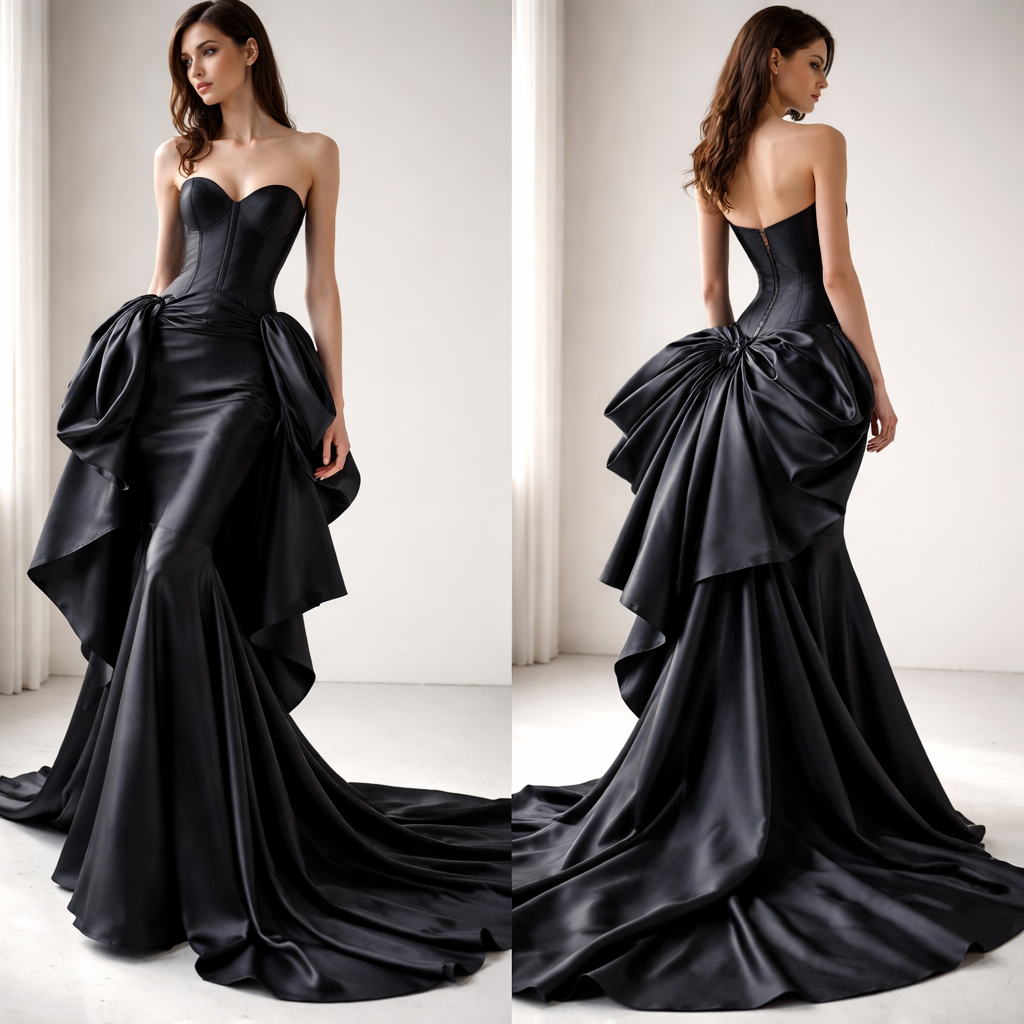 The gown begins with a structured ivory satin bodice, smooth and luminous, catching the candlelight with a soft, warm g...
