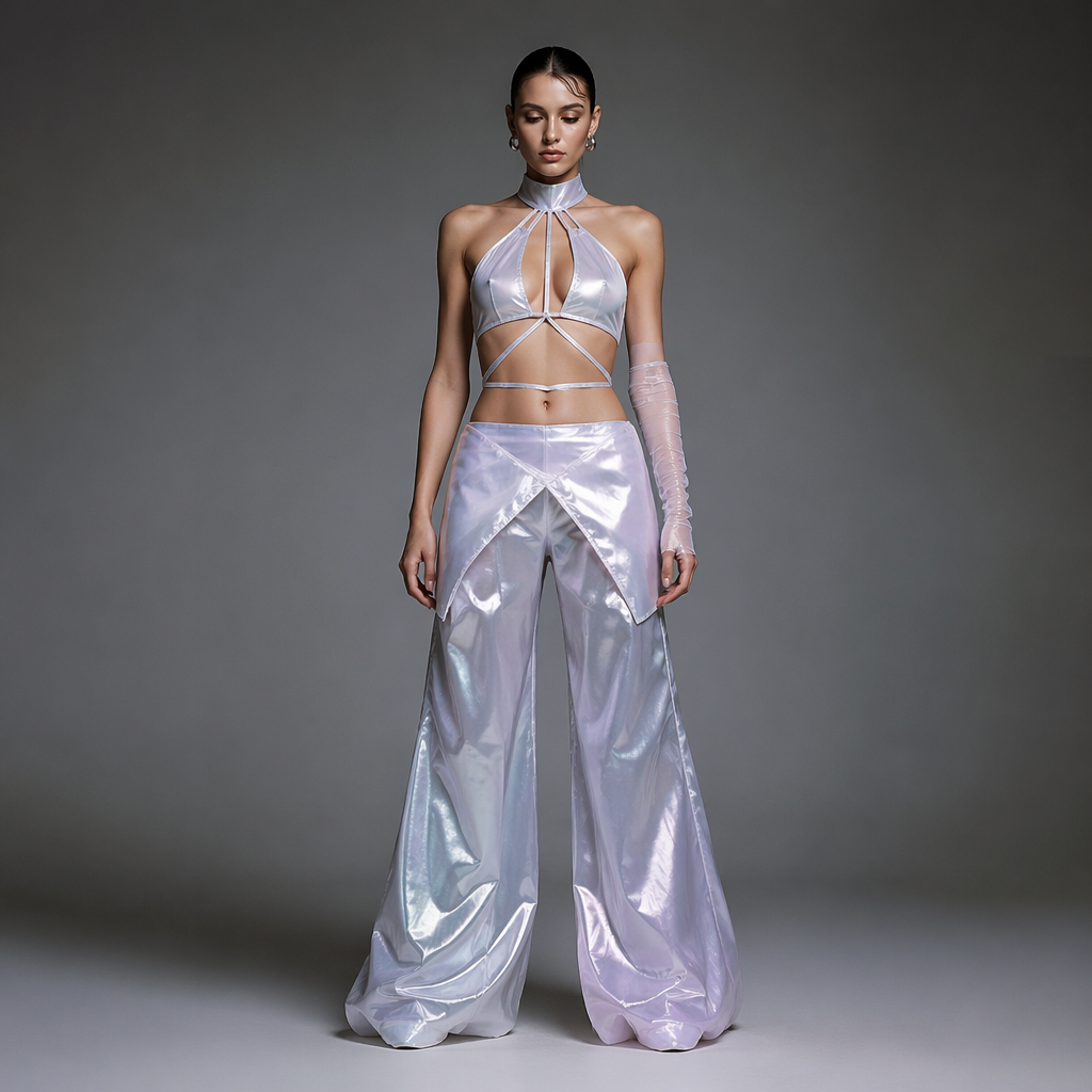 photorealistic fashion design, photorealistic fashion design, photorealistic fashion design, A Female fashion design, in Rave style. create an experimental look for me. India fashion aesthetics., rave style, just the design no text. Refinement: too much going on keep it minimalist , just the design no text. Refinement: not indian, just the design no text
