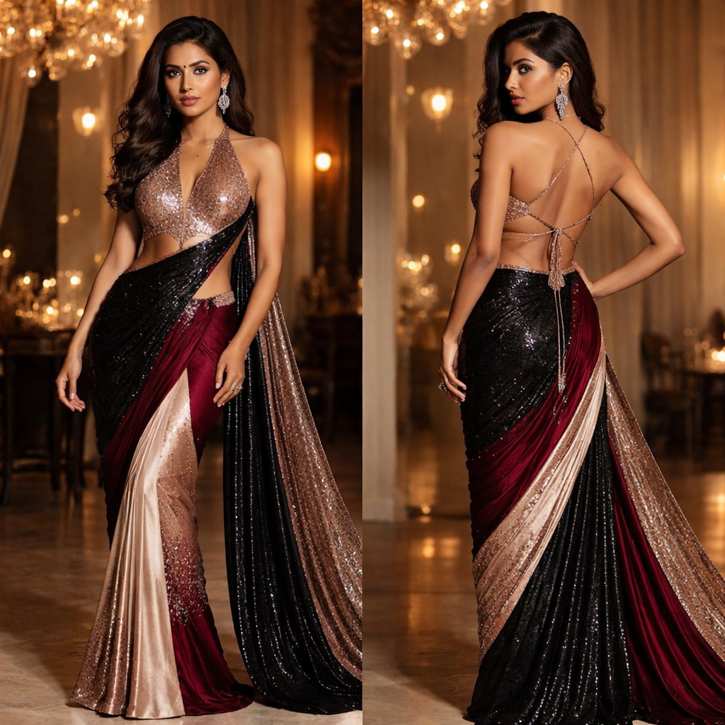 "I want a batch party saree with most wonderful colour from maroon, black, rose gold, white I want a elegant & hot made up saree Halter saree jacket, made up sa , show front and back