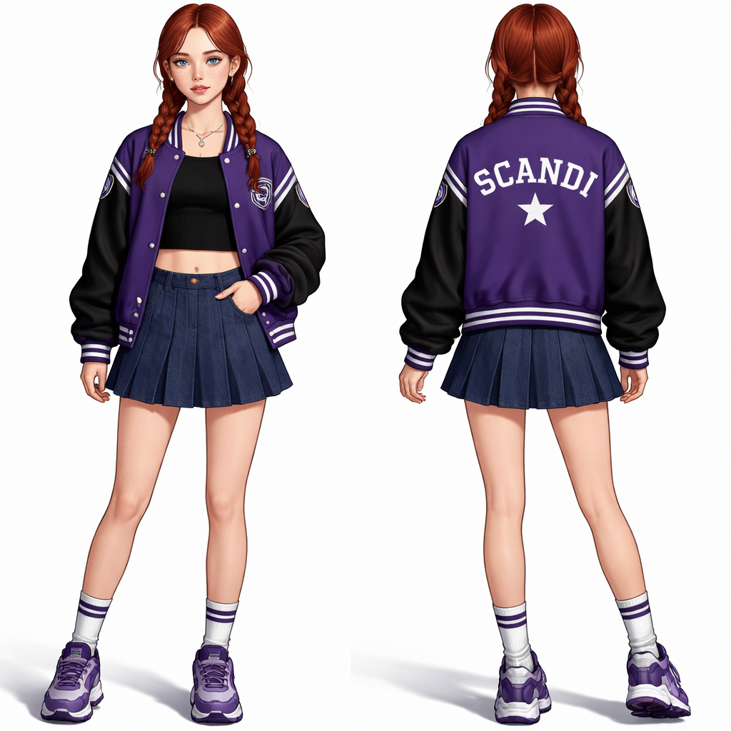 A 18 year old teenage girl with a Scandinavian face and auburn hair in two braids wears black top with a purple jacket and dark blue skirt and purple shoes , varsity style, show front and back