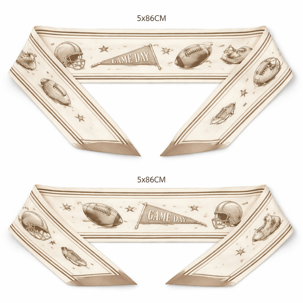 Design a silk scarf thanks 5x 86cm to be wrapped on the handle of a purse. This is for a collegiate graduation ceremony. No logos or any school relation. Make it vintage football . Way more simple Ivory and neural, classic style, show front and back
