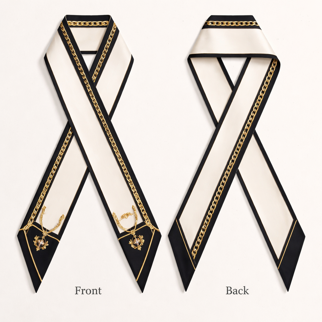 Design a silk twilly that is 5x 86 cm to be wrapped around the handle of a purse Make it iconic. Very Simple and tailored. , classic style, show front and back