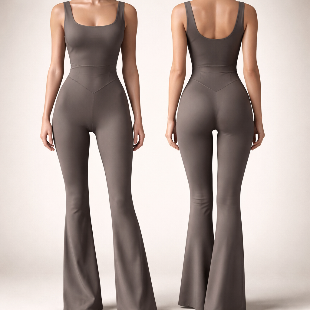 Ultra-realistic fashion design render of a women’s sculpting flare jumpsuit with completely invisible built-in shapewear and hidden internal bra support. The exterior must look smooth and seamless with no visible bra lines, no visible cups, and no indication of inner structure. The bra support is fully integrated inside the garment, providing lift and shaping without looking like a separate bra. High-waisted silhouette with strong waist-snatching compression built into the inner layer, creating a cinched waist effect while maintaining a smooth outer appearance. Internal power mesh shaping layer from under bust to mid-thigh, firm control at lower abdomen, seamless exterior finish. Sharp, sculpted V-contour seam construction at the waistline (front and back), designed to visually taper the midsection and enhance an hourglass silhouette. Side seams curve inward at the natural waist before flaring out at the hips for maximum waist emphasis. Deep V-shaped contour waistband in the back, subtle glute contour seam, and hidden under-glute compression lift band for natural lifting effect (not obvious scrunch). Sculpted hip seams to enhance curves. Slight bootcut flare leg from knee down. Wide supportive straps (3–4 cm), clean modern neckline (scoop or square), no bra-like detailing visible. Matte luxury performance fabric appearance, 75% nylon / 25% spandex look, thick 250–300 GSM, 4-way stretch, squat-proof, soft-touch finish. Flatlock seams, bonded edges, cotton gusset lining for optional commando wear. High-end minimal athleisure aesthetic, SKIMS-level luxury finish, tone-on-tone stitching, professional studio lighting, front and back view, neutral background. , sporty style, show front and back