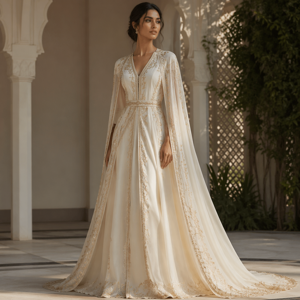 A Female Dress design, for Wedding, suitable for Summer, in Glamorous + Light Academia + Middle Eastern style