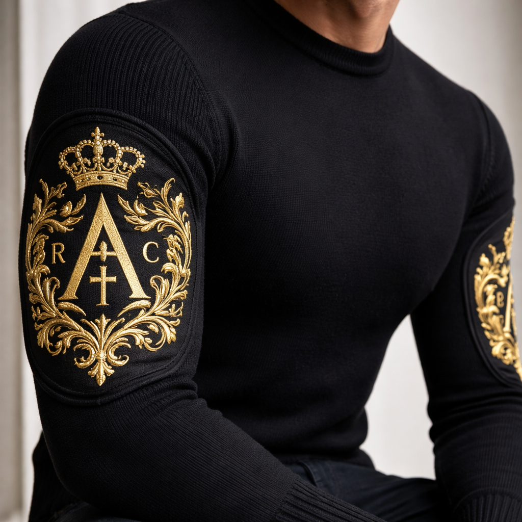 I am designing a man’s long sleeve wool slim fit top. Only on the forearms I want my crest which is sureounded by heraldry filigree all headed by a crown In the centre of the crest is a Lambda upper case Λ inside the Λ is a Christian cross On one side of thr crosses flanks is the letter R and on the other side thr letter C. This is all working thr Λ There is a heraldry crown above the Λ Placement: Epaulettes Because the design is situated on the forearm area, it mimics the "epaulette" or "forearm found on Roman Empire and Spartan traditional armour. In this case, it appears to be a raised panel that has been integrated into the knit of the sweater to provide a structural base for the decoration. 2. Technique: Bullion Embroidery The style of the gold work is likely Bullion Wire Embroidery (also known as Goldwork). This is a traditional method used for military crests and high-end heraldry. • It uses fine wire threads (often gold or silver-plated) rather than standard polyester or rayon thread. • It creates a high-relief, 3D effect that is far more rigid and reflective than standard flat embroidery. 3. Application: Patch vs. Direct Looking at the edges of the gold crest, it is most likely a Pre-made Embroidered Patch (Appliqué) that has been stitched onto the forearm panel. • Why a patch? High-density bullion work is very heavy. Embroidering it directly onto a flexible knit sweater would cause the fabric to sag or pucke