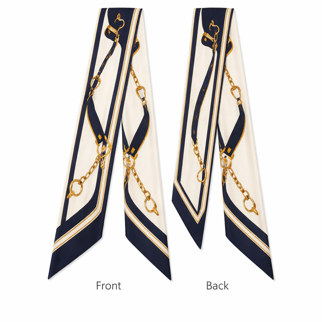 Design a silk twilly that is 5x 86 cm to be wrapped around the handle of a purse Make it iconic. Very Simple and tailored. , classic style, show front and back