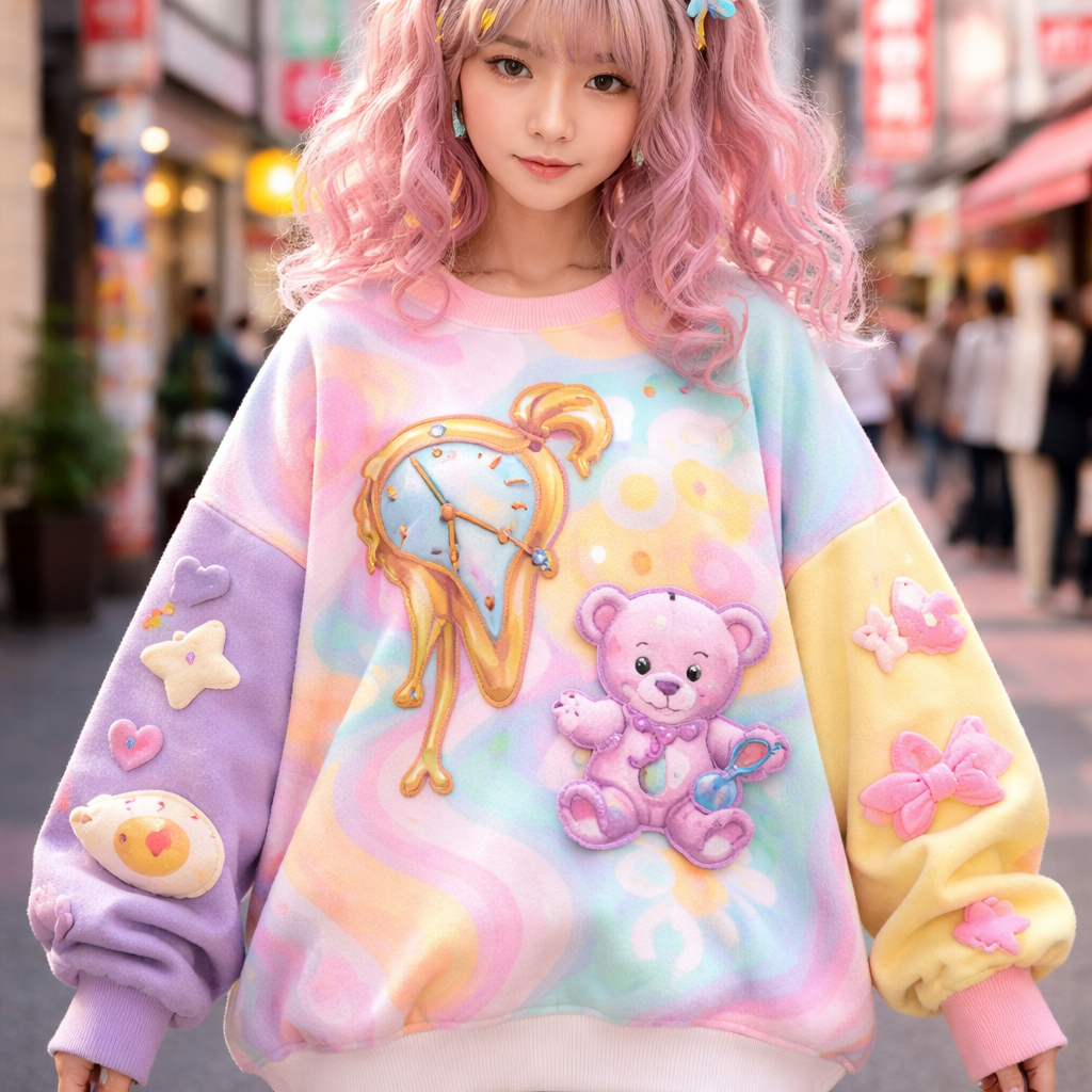 Japanese Street fashion design: **Dali Meets Kawaii Sweater:** Oversized cotton sweater in soft pastel swirl patterns and bright accents. Dropped shoulders, relaxed fit, with playful, mismatched sleeves.