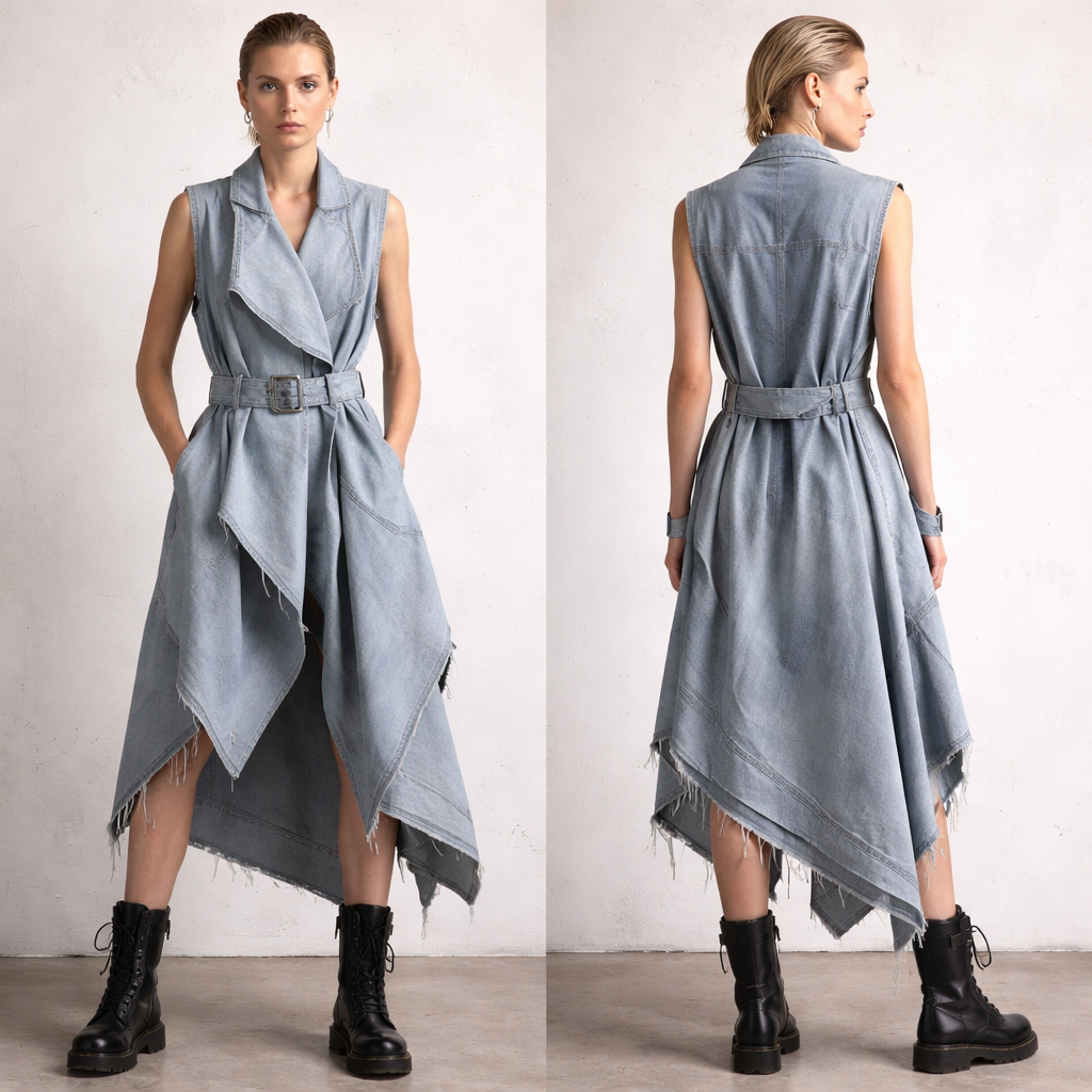 material should be cotton twill,light denim or canvas…Length: mid-calf Big open armholes Asymmetric front panels Belt or straps on the waist Raw edges or exposed seams
