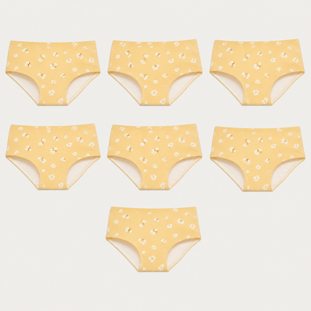 photorealistic fashion design, A Female Dress design, suitable for Spring, in Classic style. 6 pack seamless kids underwear. Yellow with white flowers. Ultra soft, minimal irritation.. Sweden fashion aesthetics., classic style, just the design no text. Refinement: Make it seven instead of six