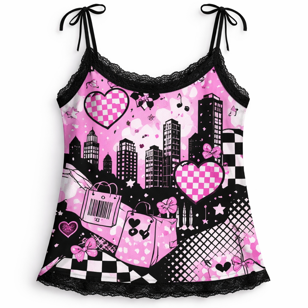 kawaii meets mc escher tank top in bright pink black and white with black lace trim