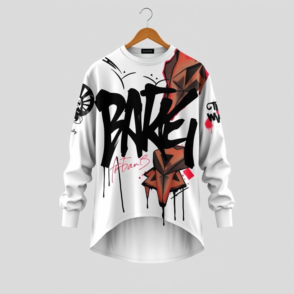 Design a long-sleeved streetwear shirt that fuses edgy and artsy elements. Incorporate an asymmetric silhouette with unique, bold patterns that capture contemporary urban aesthetics. Use a crisp white base as a canvas for artistic graphics inspired by graffiti. Add casual yet elegant detailing for a standout piece in modern street style.