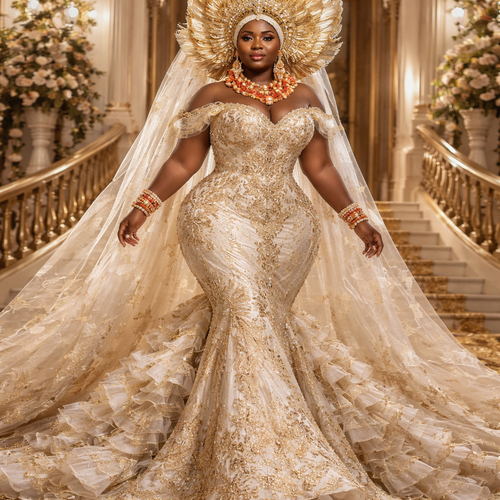 Extravagant Congolese traditional wedding masterpiece, dramatic couture gown with huge royal volume, 12-meter veil, brow...
