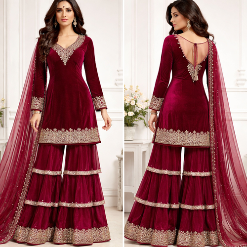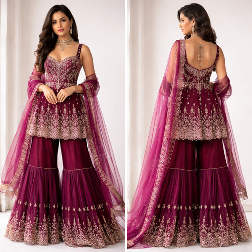 A sharara set in organza cloth dark velvet pink