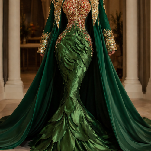 Elegant herbal green evening gown, floor-length, sleek silhouette with a high thigh slit, luxurious gold embroidery with...