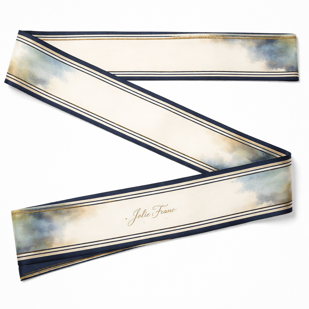 Design a 5cm x 86cm silk twill scarf for a luxury brand called Jolie Franc. The style blends American preppy tailoring, British refinement, and subtle French Impressionist artistry. Feature a clean, tailored interior field with a softly painterly border inspired by French Impressionist light and atmosphere. The border should show gentle color transitions rather than visible brushstrokes. Use a timeless, all-season palette of warm ivory, deep navy, soft steel blue, and muted olive, with discreet antique gold detailing. Include a precise framed border and hand-rolled edges. The overall design should feel polished, artistic, and instantly recognizable when wrapped around a Kelly-style bag handle or worn for elegant day-to-evening occasions., classic style, show front and back