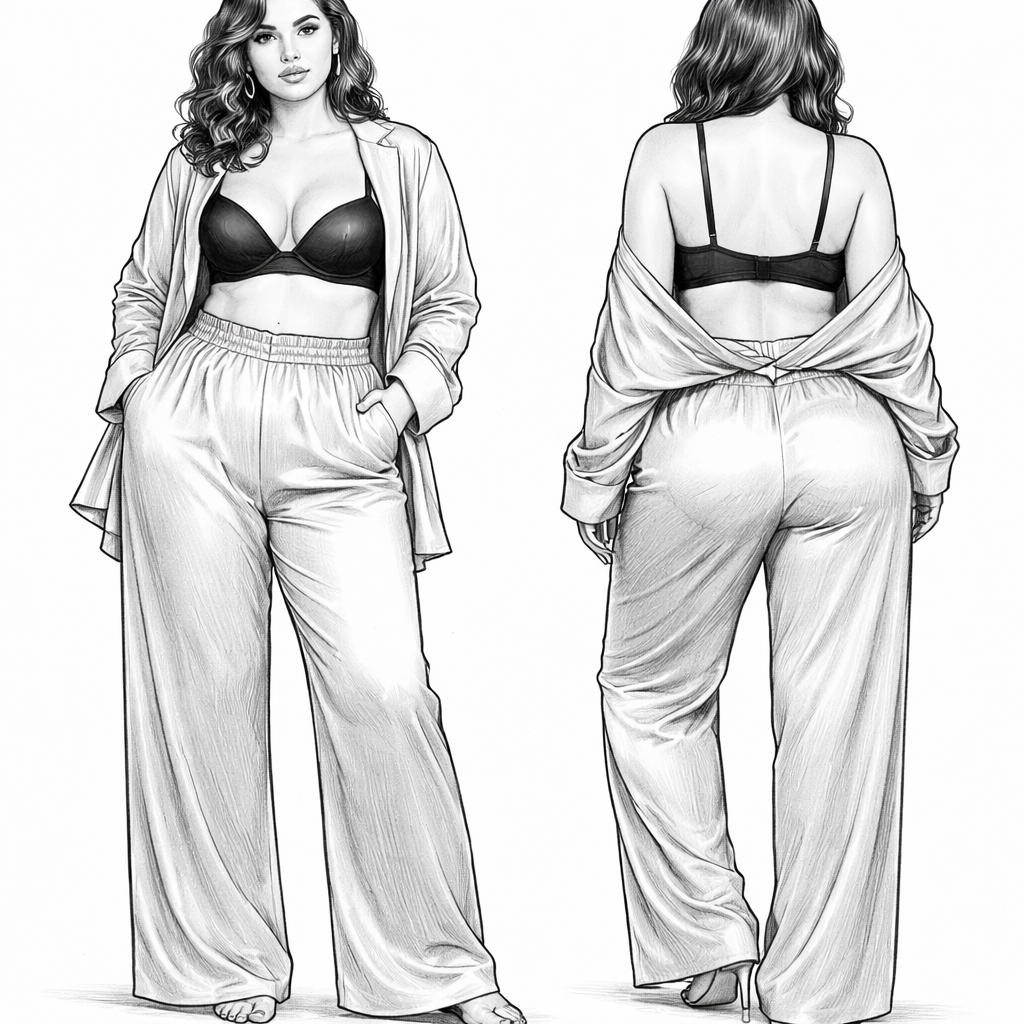 Ik want a fashion sketch of a front and back with a brallete. Like in the skims style. In black and white. With a pyjama blouse and pants. On a person thats a bit thick. No strings and no buttons on the pants and make the brallete a bit sexy