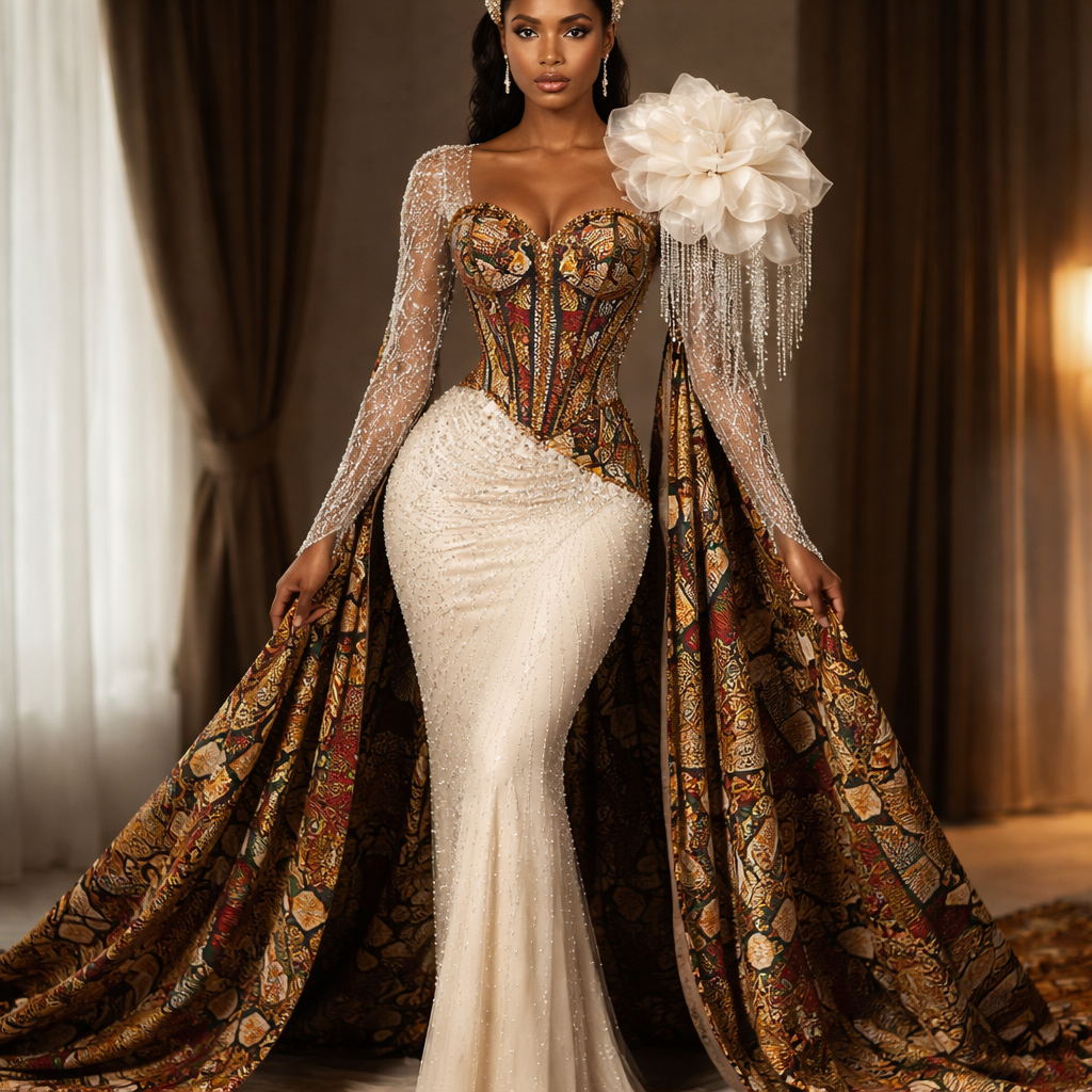A beautiful dress, with beaded long sleeves, and a big flower that extend out with dripping diamonds like rain on one of the shoulders, the corset should have an African traditional pattern, the bottom should be a straight pencil like flow with beadings and it should have a cape with the same African traditional pattern as the corset